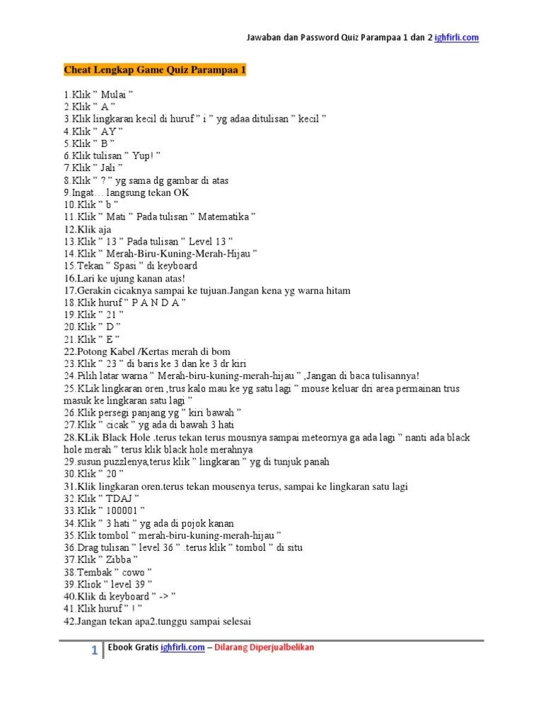 Jul 13, 2011 · main parampaa 1. Ayobelajar # level 29 : Di titik dihuruf i 4. A.l.f.a.b.e.t yang kelima adalah b ( pilih b ) 6. Jun 01, 2017 · password quiz parampaa 1 # level 11 :